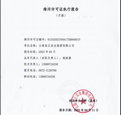 2022年云南皇正實業集團有限公司排污許可證季報 - 第一季度 2022年云南皇正實業集團有限公司排污許可證季報-第一季度