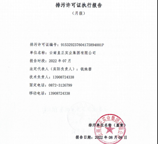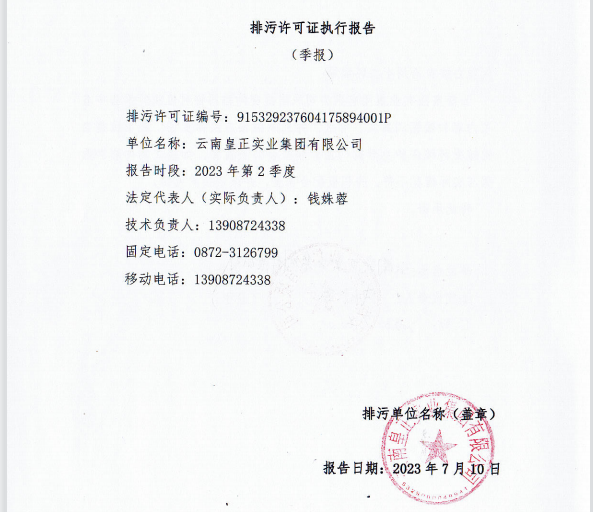 2022年云南皇正實業集團有限公司排污許可證季報 - 第二季度 排污許可證季報-第二季度